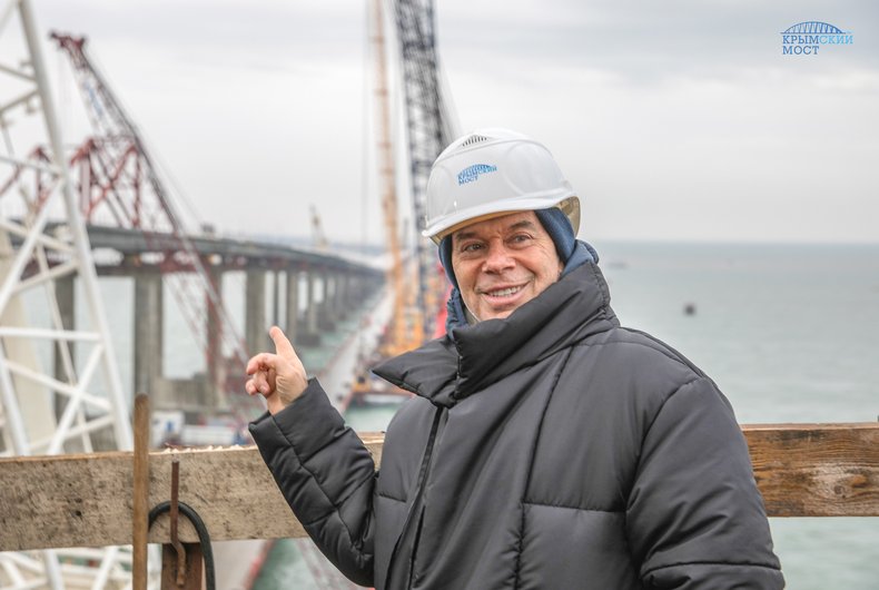 «Строители Крымского моста пригласили Олега Газманова посетить стройплощадку в Керченском проливе… Артист поднялся на железнодорожную арку и с высоты 35 метров – высота арочного пролета над водой – увидел строительство моста», –отмечается в заметке.