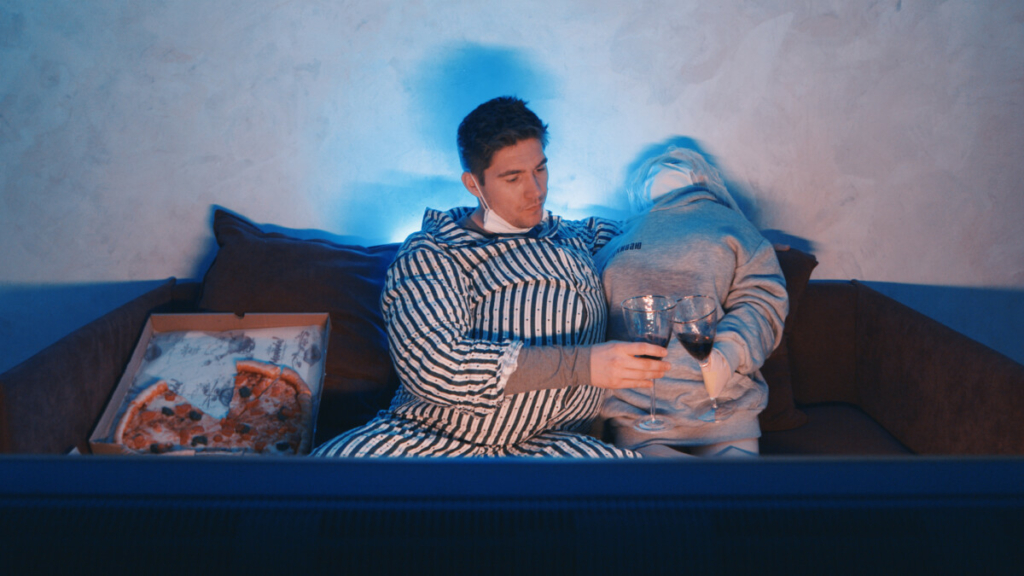 Локацией для съемки танцевально-ироничного клипа выступила квартира Остапчука, где он остался совершенно один, если не учитывать секс-куклу, которая вместе с артистом стала главной героиней пародии. Они вместе играют в приставку, #подбухивают и повторяют движения ногами, как в вирусном флешмобе Little Big. Не обошлось в видео и без обязательных атрибутов карантинобудней: нескольких десятков защитных масок, рулонов дефицитной туалетной бумаги, килограммов еды и пижамного дресс-кода. Стоит отметить, что автором лирики выступил сам Остапчук.