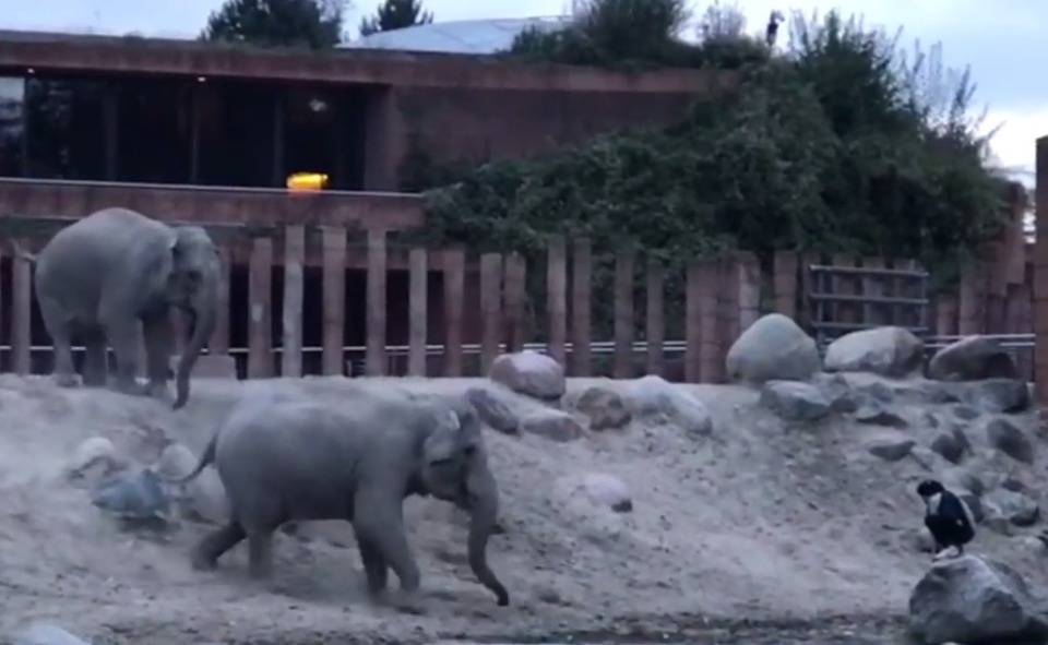В зоопарке Копенгагена один из посетителей прыгнул в вольер со слонами и уселся на камне, наблюдая за животными. Но они были явно не рады незваному гостю. Взрослые слоны стали защищать маленького слоненка и демонстрировать неприкрытую агрессию, желая прогнать случайного посетителя.