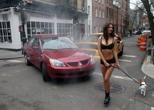 Один из ангелов Victoria’s Secret Эмили Ратаковски прогулялась по зимнему Нью-Йорку в одном нижнем белье. В одной руке у модели был поводок собачки, а в другой – стаканчик с кофе. Таким образом она снялась для рекламной кампании DKNY.