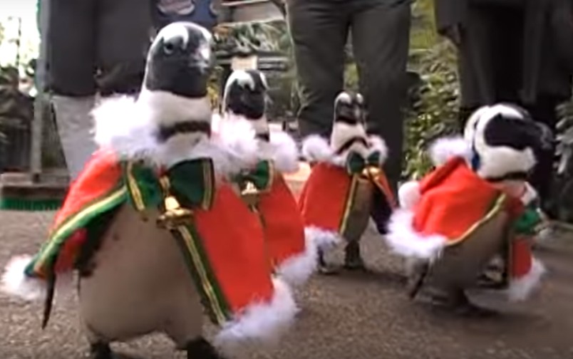 В японском городе Мацуэ состоялось небольшое шествие пингвинов. Оно было посвящено приближающемуся Рождеству. В мини-параде приняло участие шесть пингвинов, которые были наряжены в костюмы Санта-Клаусов.