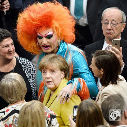 Фото канцлера Ангелы Меркель и художника-трансвестита под псевдонимом Оливия Джонс вызвало бурную реакцию соцсетей.