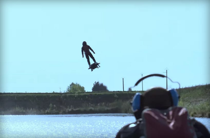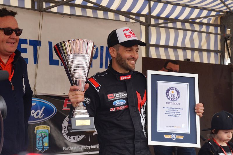 Создатель флайборда Френки Запата осуществил полёт в субботу утром у берегов Соссе-Ле-Пен на юге Франции, взлетев с помощью ховерборда на расстоянии более 2000 метров (6500 футов).