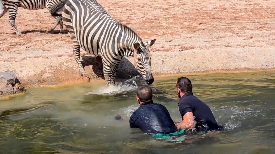 Обычно зебры сразу после рождения пытаются стать на ноги и пойти, но у малыша даже небыло шанса это сделать. Малыш истошно кричал, пытаясь держать голову над поверхностью воды. Рабочим пришлось нырять за ним, чтобы спасти.