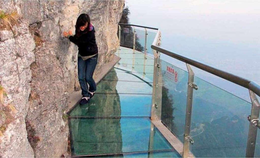 В Китае популярный стеклянный мост над пропастью снабдили зрелищными спецэффектами. Его построили три года тому на высоте более 7 км, длина стеклянной смотровой площадки составляет 26 м.