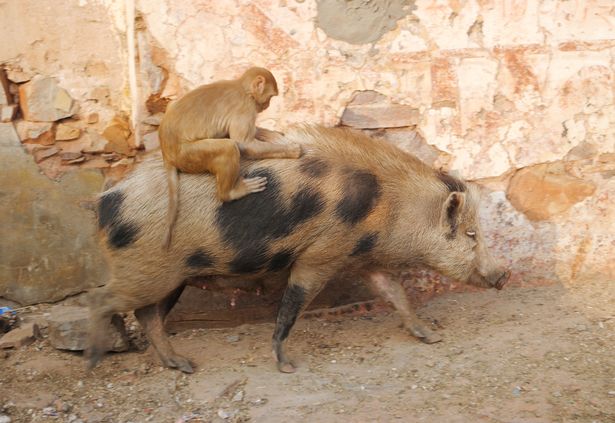 На прогулке супруги заметили свинью, на спине которой спокойно сидела обезьяна. Странная парочка продвигалась по улице. Хрюша остановилась у мусорного бака, а ловкая макака схватила остатки пищи, а потом разделила свою добычу со свиньей.