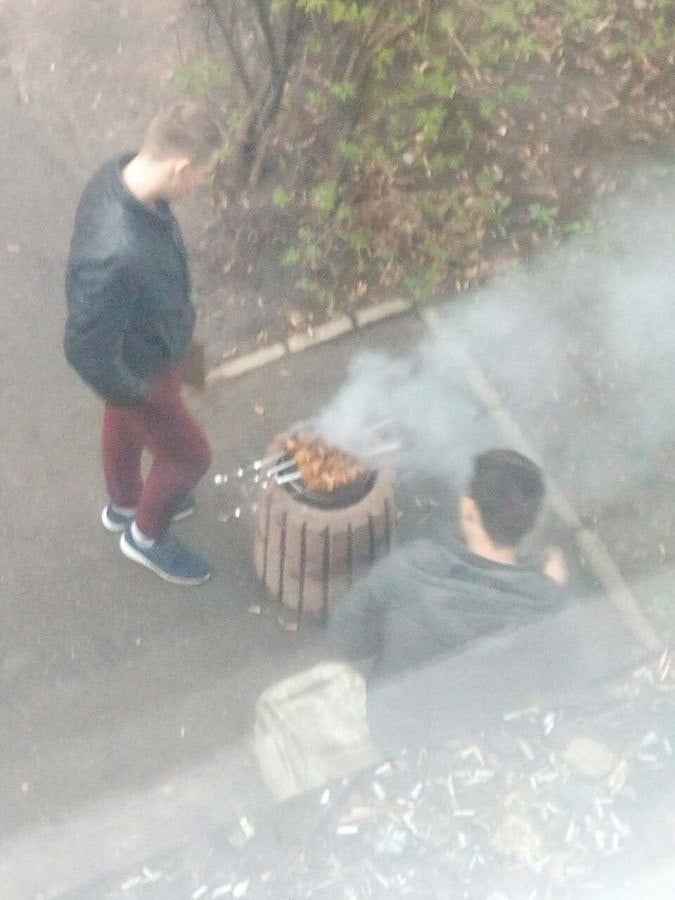На фотографии можно увидеть, что креативные молодые люди развели огонь внутри урны и положили на нее шампуры с мясом для шашлыков, продемонстрировав жителям близлежащих домов, как можно готовить популярное праздничное блюдо прямо во дворе.
