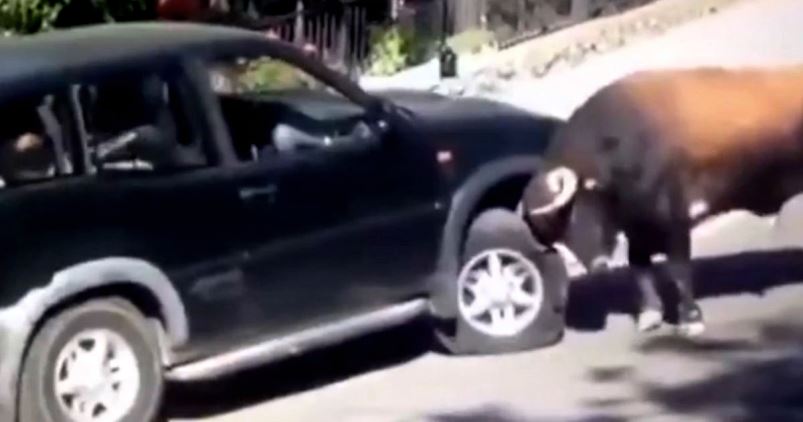 Появилось видео, в котором бешеный бык атакует джип