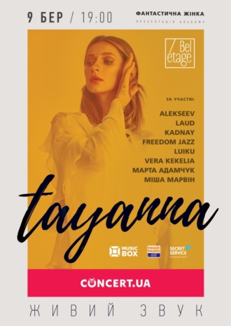 9 марта на сцене столичного клуба Bel’etage певица TAYANNA представит новую концертную программу «Фантастична жiнка». В сет-лист концерта войдут ранее неизданные треки из третьего студийного лонгплея певицы, а также песни из альбомов: «TAYANNA. Портреты», «Тримай мене», синглы и кавер-версии легендарных украинских хитов.
