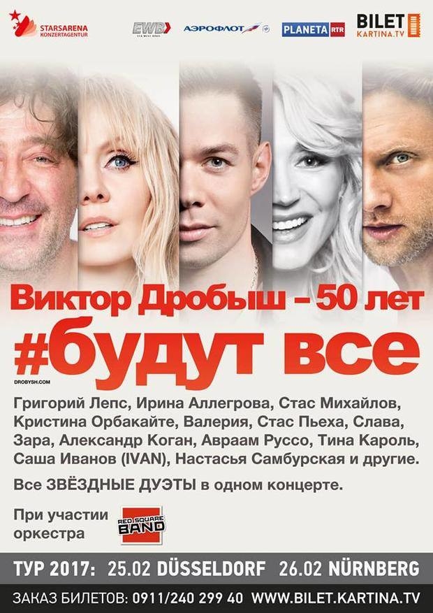 В Сети разразился скандал вокруг имени украинской певицы Тины Кароль, которое фигурирует в афише к юбилейному концерту Виктора Дробыша в Германии и США. Нужно отметить, что на одной афише с исполнительницей значатся пропутинские артисты: Стас Пьеха, Валерия, Григорий Лепс и Стас Михайлов.