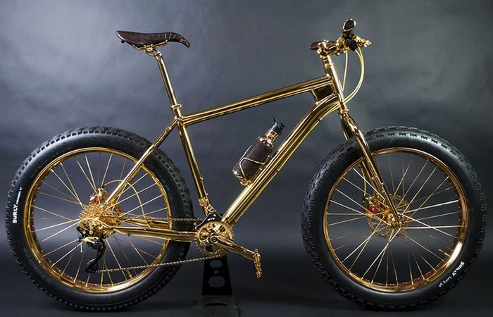 А наиболее дорогим оказался полностью золотой велосипед. Таких в мире всего 13. Также при его создании использовались драгоценные камни. Например, логотип компании-производителя выложен 600 черными бриллиантами и 400 желтыми сапфирами. Стальной корпус велосипеда покрыт золотым напылением, а на сидение натянута кожа крокодила. Цена такого велосипеда достигает $500 тыс.