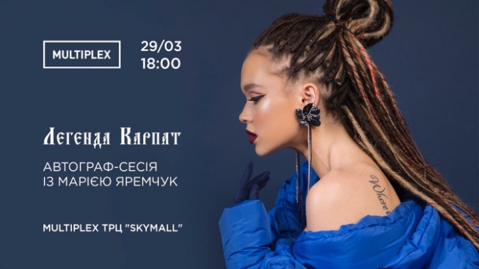 С 29 марта во всех кинотеатрах Украины стартует показ украинской биографической ленты, рассказывающей об Олексе Довбуше. В главных ролях – Мария Яремчук и Валерий Харчишин. Автограф-сессия с главной героиней Марией Яремчук премьерный показ фильма состоится 29 марта, в кинотеатре Multiplex (ТРЦ «SkyMall»). Начало – в 18:00.