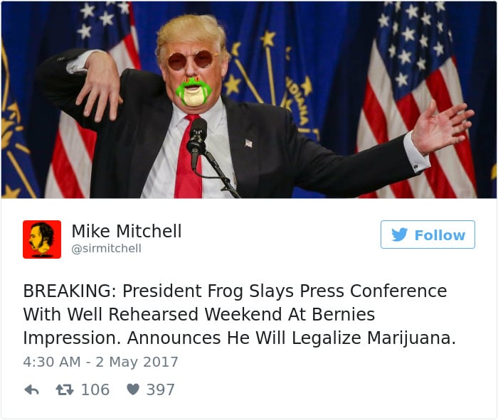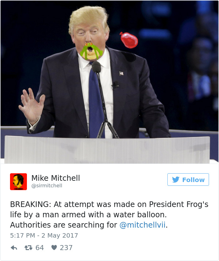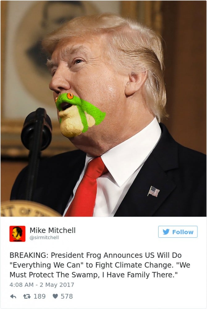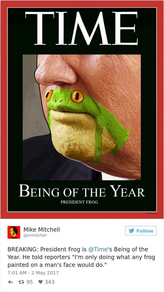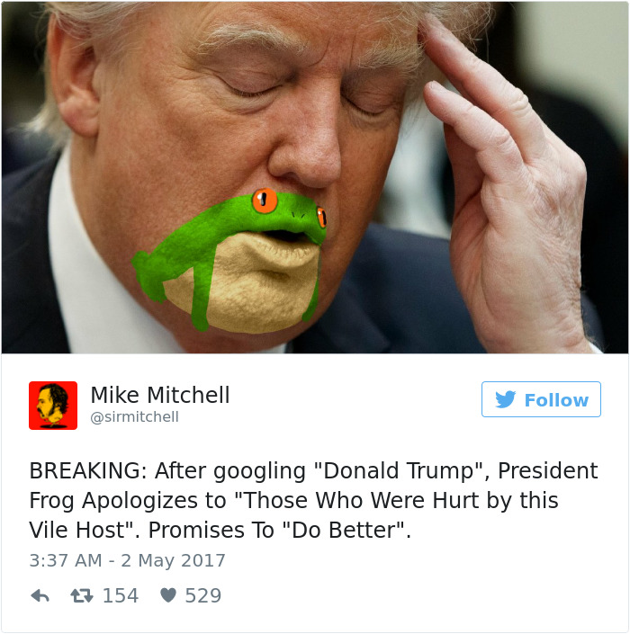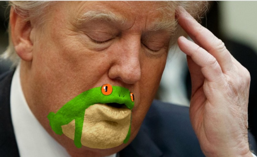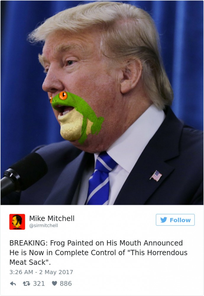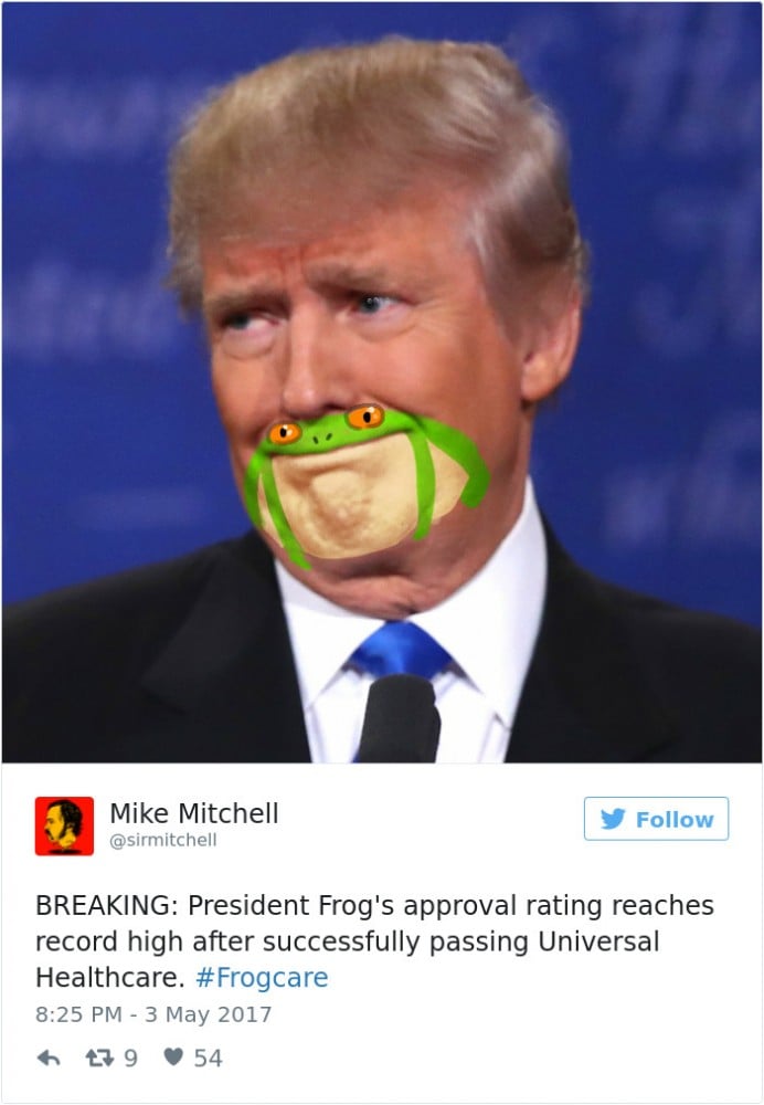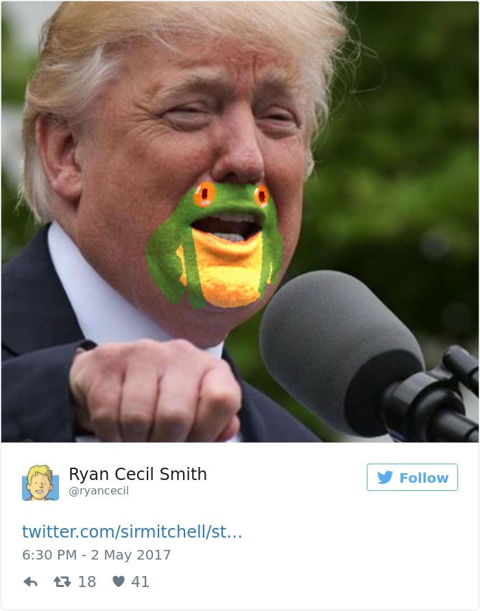 Каждая новая иллюстрация на эту тему собирает огромное количество репостов и лайков. Первая же карикатура с жабой на лице у Трампа была подписана «Срочная новость: Трамп представил своего нового советника, жабу, нарисованную на лице».