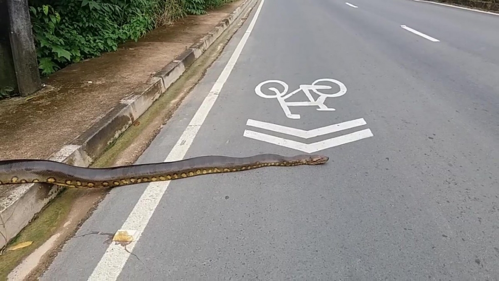 Змея, длинной около 3,5 м перекрыла движение на проезжей части. Этот случай произошел в бразильском городе Манаус.