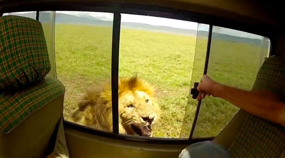 В Восточной Африке в Национальном парке Серенгети турист высунул из джипа руку и попытался погладить дикого льва, который стоял рядом с авто.