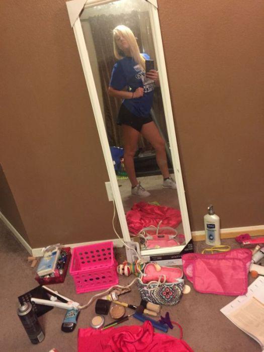 Девушки очень любят сделать сексуальные селфи, но совершенно забывают об антураже. Эти фото наглядно показывают, почему перед тем, как принимать томные позы у зеркала следует немного прибраться в комнате, в противном случае обстановка способна убить любой романтический настрой и сексуальное желание.