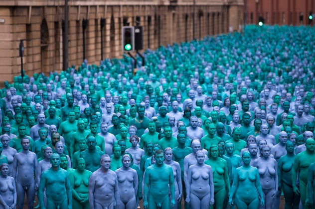 Около 3 тысяч обнажённых и раскрашенных синей краской жителей британского города Халл приняли участие во флешмобе, организованном американским фотографом Спенсером Туником, пишет Artnet.