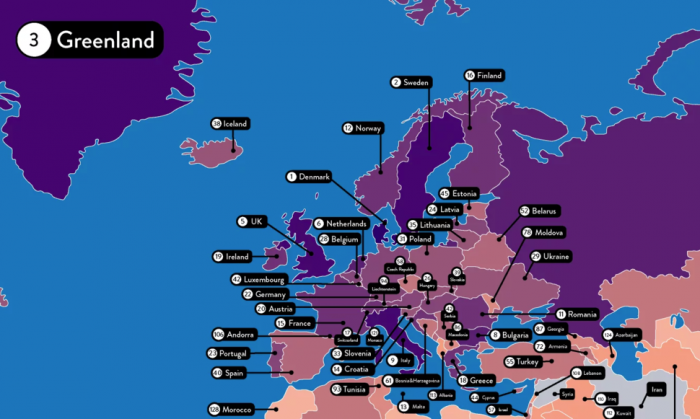Также в первую десятку входят последовательно Швеция, Гренландия, США и Великобритания. Франция, которая пользуется имиджем самой романтической страны, заняла в этом рейтинге лишь 15-е место. Германия оказалась на 22-м. А Украина – на 29-м.