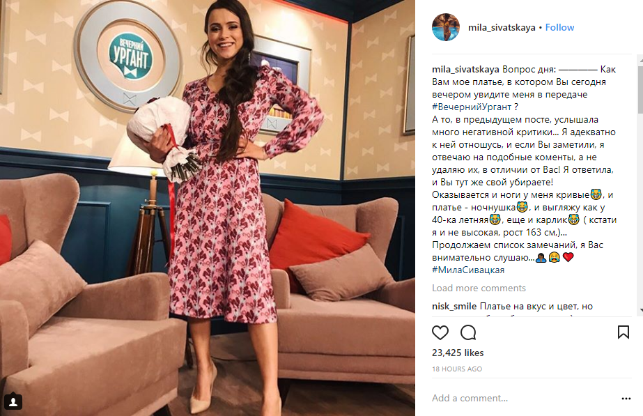 Украинская актриса Мила Сивацкая снялась в России в программе «Вечерний Ургант»ю. На шоу она пришла в платье, которое озадачило ее поклонников.
