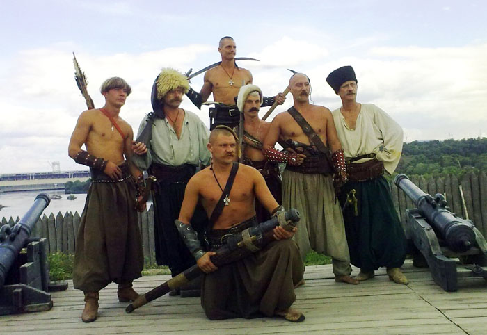 «Мы потомки славных запорожцев, оккупантам уши надерем. С нами правда, и мы победители, родную землю мы убережем!» — поют музыканты.