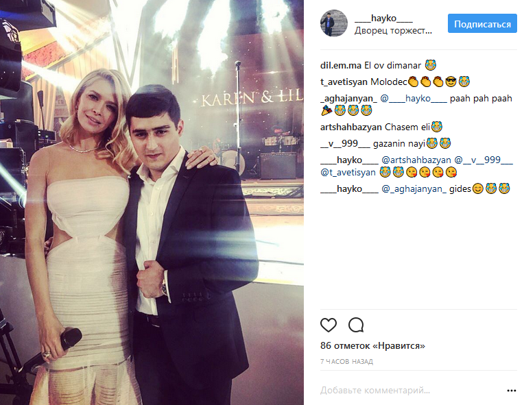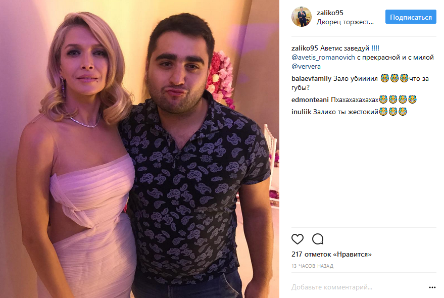 Кроме Веры Брежневой гостей сына главы группы компаний «Ташир» также развлекали Эрос Рамазотти, Сергей Шнуров, Алла Пугачева, Ксения Собчак, Филипп Киркоров и Тимати.