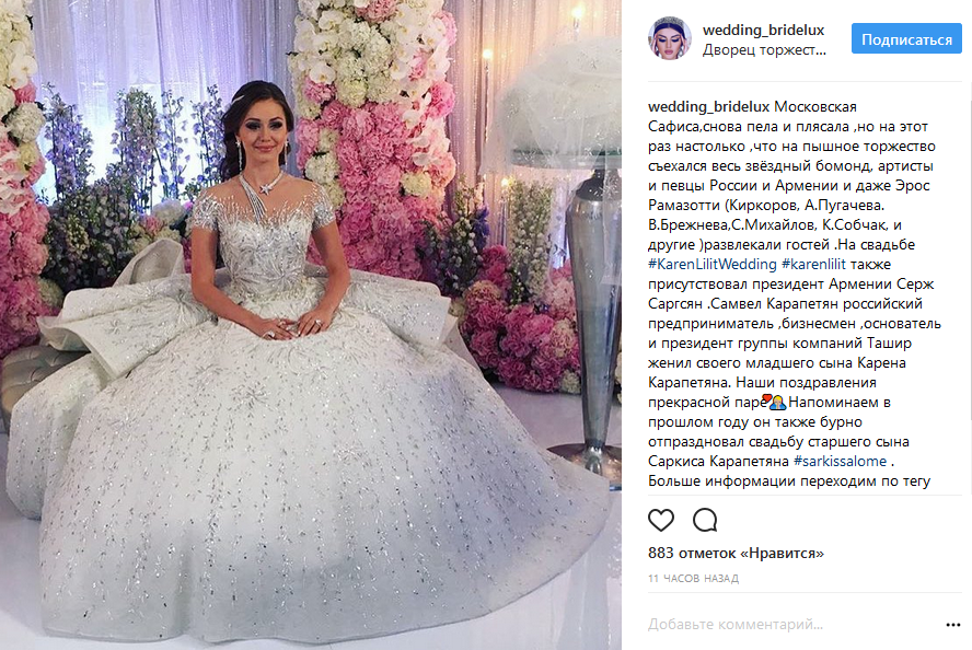 Исполнительница Вера Брежнева выступила на шикарной свадьбе сына одного из богатейших российских предпринимателей Самвела Карапетяна.