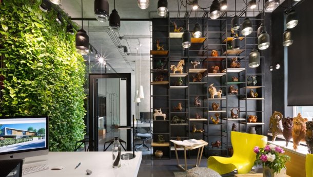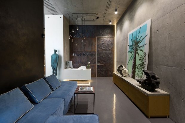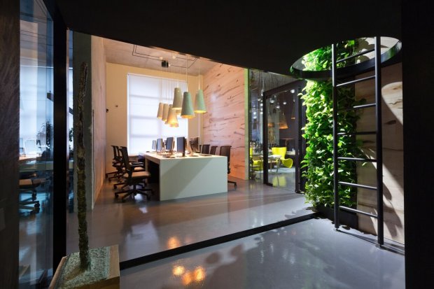 При создании интерьера использовались такие материалы, как камень, бетон, медь, стекло, бронза и латунь. А температуру воздуха, звук и освещение в таком офисе регулируют при помощи системы «умный дом».