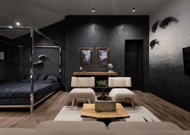 В этом дизайне сочетаются элементы японского и украинского этно-стилей. При этом аутентика гармонично сочетается с современными технологиями. В частности, стены оформлены глиной в стиле хаток-мазанок, а потолок декорирован грубыми деревянными балками-перекрытиями.