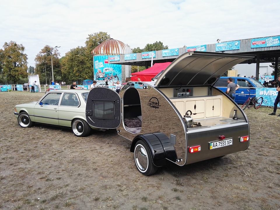Украинский кемпер почти не отличается по дизайну от оригинал. По форме это классическая капля — самая обтекаемая форма в природе. В прицепе она использовалась для меньшего сопротивления движению. Но взоры притягивает не это и даже не компактность домика на колесах, а зеркальный корпус, в котором видно собственное отражение.