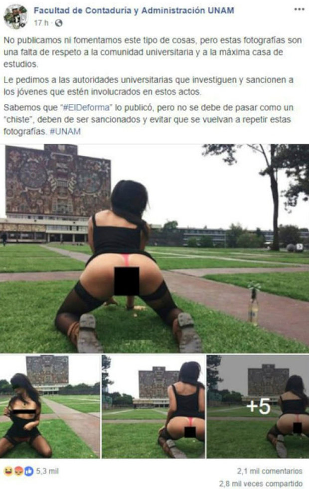 Национальный автономный университет Мексики разместил в соцсетях фото девушки, позирующей в пикантных позах топлесс, а также демонстрирующей свои прелести на территории учебного заведения. Пару фото были сделано рядом с библиотекой и университетским парком. Об этом сообщает Daily Star.