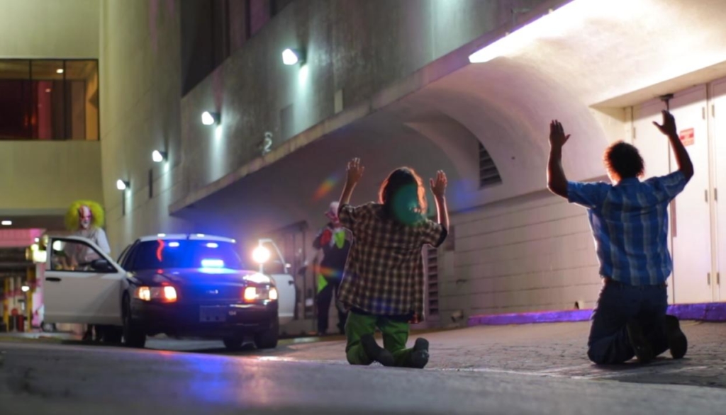 Вернемся к пугающим розыгрышам. Злые клоуны стращают людей где придется — на заправке, в отеле и в подворотне. Довольно эффектно.