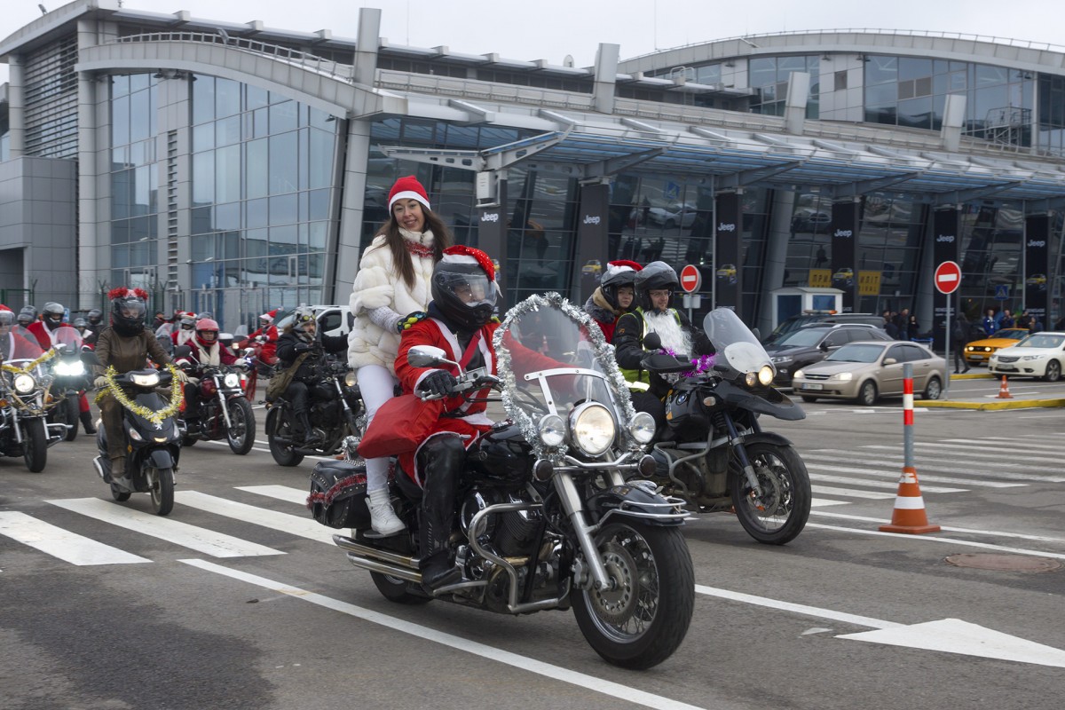 Праздничный аэропорт: в канун Нового года, 31 декабря в аэропорту «Киев» Мото-Санта Клаусы встретили Снегурочек