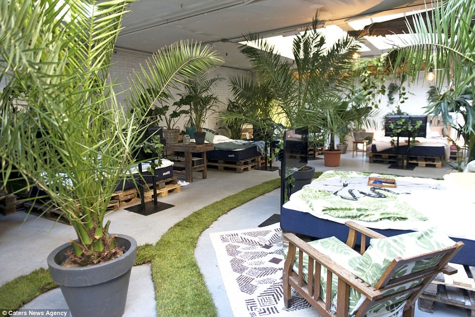 В заведении люди могут отдыхать, лежа на кроватях, перед каждой из которых установлен телевизор. Им также предлагают богатые витаминами смузи и другие полезные продукты. Кроме того, страдающим от злоупотребления алкоголем делают массаж.