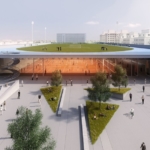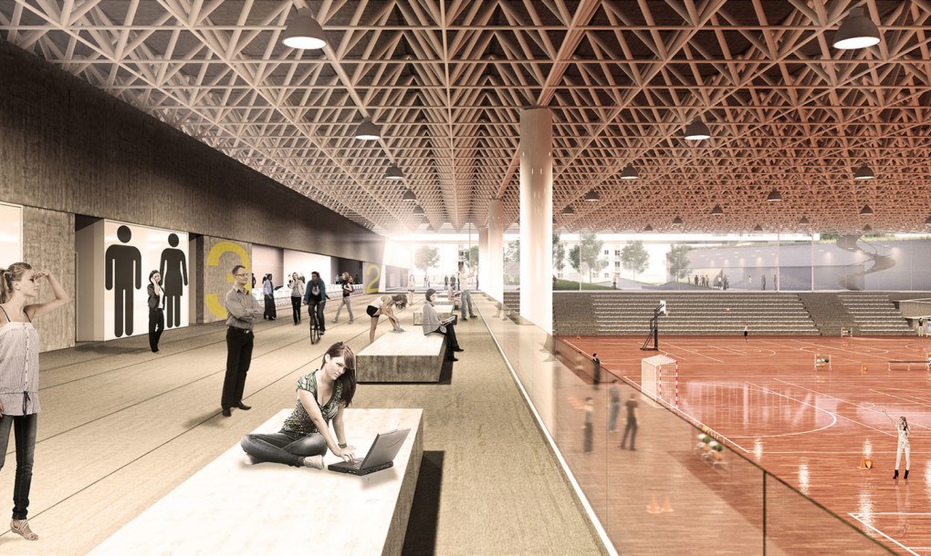 Так, два высоких здания планируется соединить широкой прямоугольной постройкой. На первом уровне павильона разместиться комплекс кортов, а на втором – спортивная площадка, включающая также огромное футбольное поле в натуральную величину.