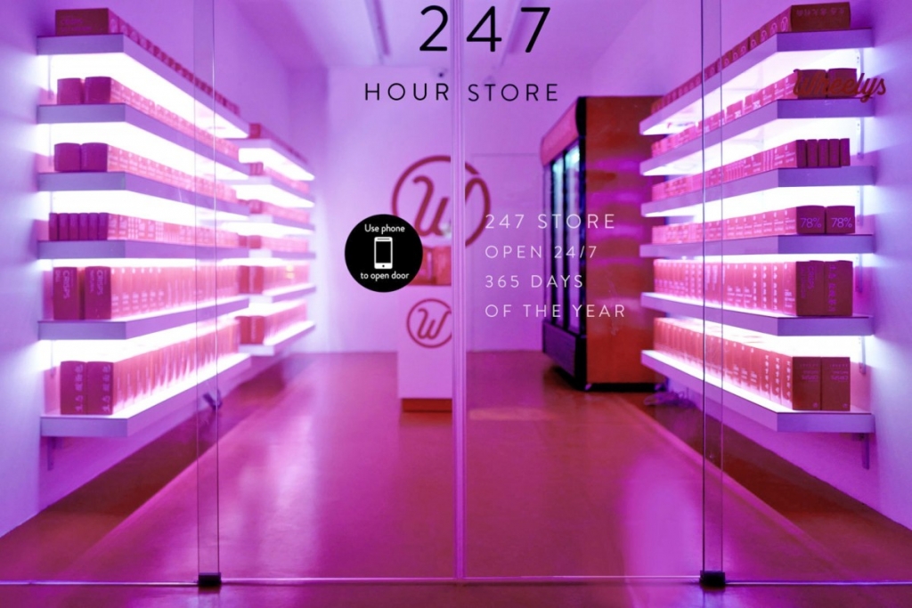 Магазин Moby построен на колёсной платформе, которая позволяет ему перемещаться по территории кампуса по заданной траектории. Торговая точка работает круглосуточно, но попасть в неё могут только покупатели, использующие приложение-компаньон с привязанной банковской картой.