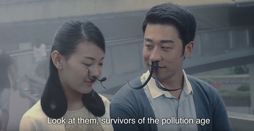 В Китае запустили ролик, рекламирующий длинные волосы в носу, которые защищают от смога. По замыслу создателей видео, такая растительность в будущем станет необходимостью.