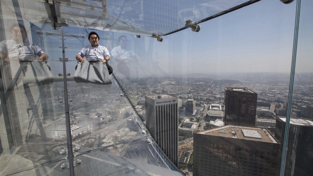 В Лос-Анджелесе на Башне Банка США (самом высоком небоскребе в Калифорнии) появился новый аттракцион — стеклянная горка. Она проходит снаружи здания, поэтому все, кто рискнет испробовать горку, окажется над 300 метрами пустоты.