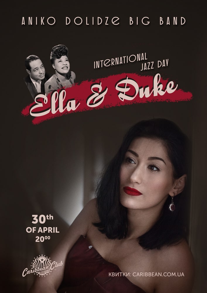 30 апреля в Международный день джаза Aniko Dolidze Big Band презентует новую программу Ella & Duke в Caribbean Club Concert Hall. Волшебная Анико Долидзе представит две грандиозные фигуры джазовой музыки в одном концерте — Эллу Фицджеральд и Дюка Эллингтона.