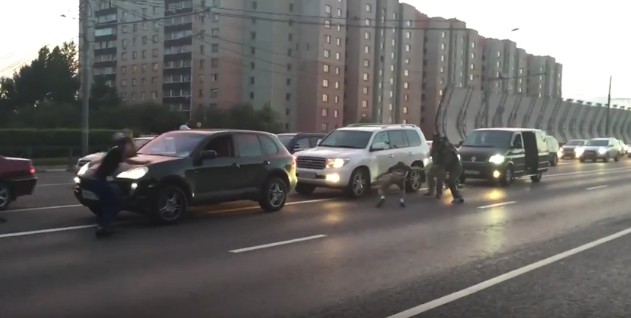А дальше начинаются «маски-шоу». Из микроавтобуса выбегают несколько вооруженных мужчин в камуфляже (по всей видимости, сопровождавших белый внедорожник) и «скручивают» агрессивного водителя и его пассажиров. Один из этих мужчин садится за руль черного внедорожника, после чего все три машины быстро удаляются с места происшествия. Велосипедиста к этому моменту уже нигде не видно.