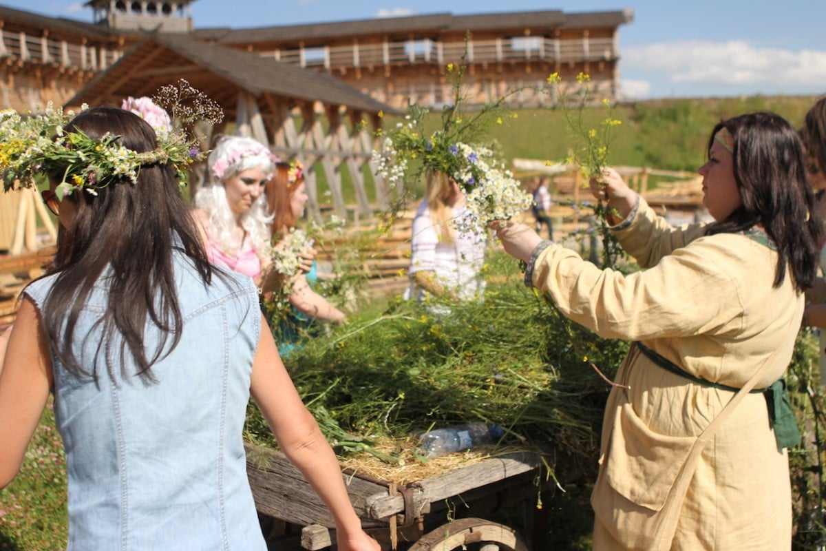 Сразу за воротами вас встретят хлебом-солью, а также предложат взять зеленые травы для украшения города. На улице вы увидите большой воз, полный различных трав и цветов, из которых можно будет сплести себе венок. В древности венки выступали хранителями от злых сил и всякой беды, на Троицу их надевали как женщины, так и мужчины. Каждый желающий сможет принять участие в мастер-классе по плетению венков и затем продемонстрировать его во время конкурса на лучший венок.