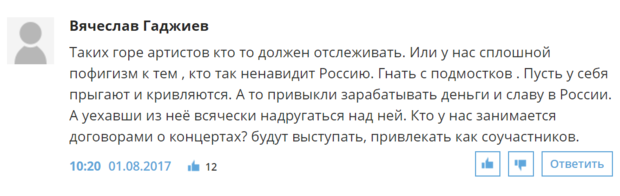 Одно из крупнейших изданий наших северных соседей даже выпустило ожесточённую статью под заголовком «Украинские звезды едут в Россию — заработать на борьбу с русскими». В частности авторы статьи отмечают, что украинские музыканты часто открещиваются от своих ранее сказанных слов в поддержку украинского Донбасса, после чего с улыбкой одевают футболки с российской символикой. Это всё делается, чтобы попасть на более денежную российскую сцену.