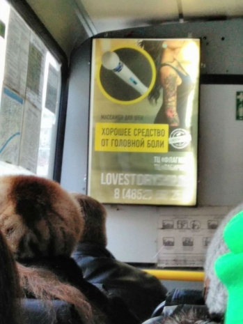 В российском Ярославле в автобусах маршрута №97 развесили рекламу массажёров, которые характеризуются, как «Хорошее средство от головной боли». Однако основное предназначение этого агрегата – женская мастурбация.