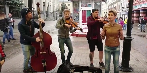 В ролике видно, что девушка подошла к скрипачу ансамбля «Злачное Место», что-то прошептала ему на ухо, а затем зычно начала распевать пророссийский хит пропагандистской группы «Поющие вместе», «Такого, как Путин».