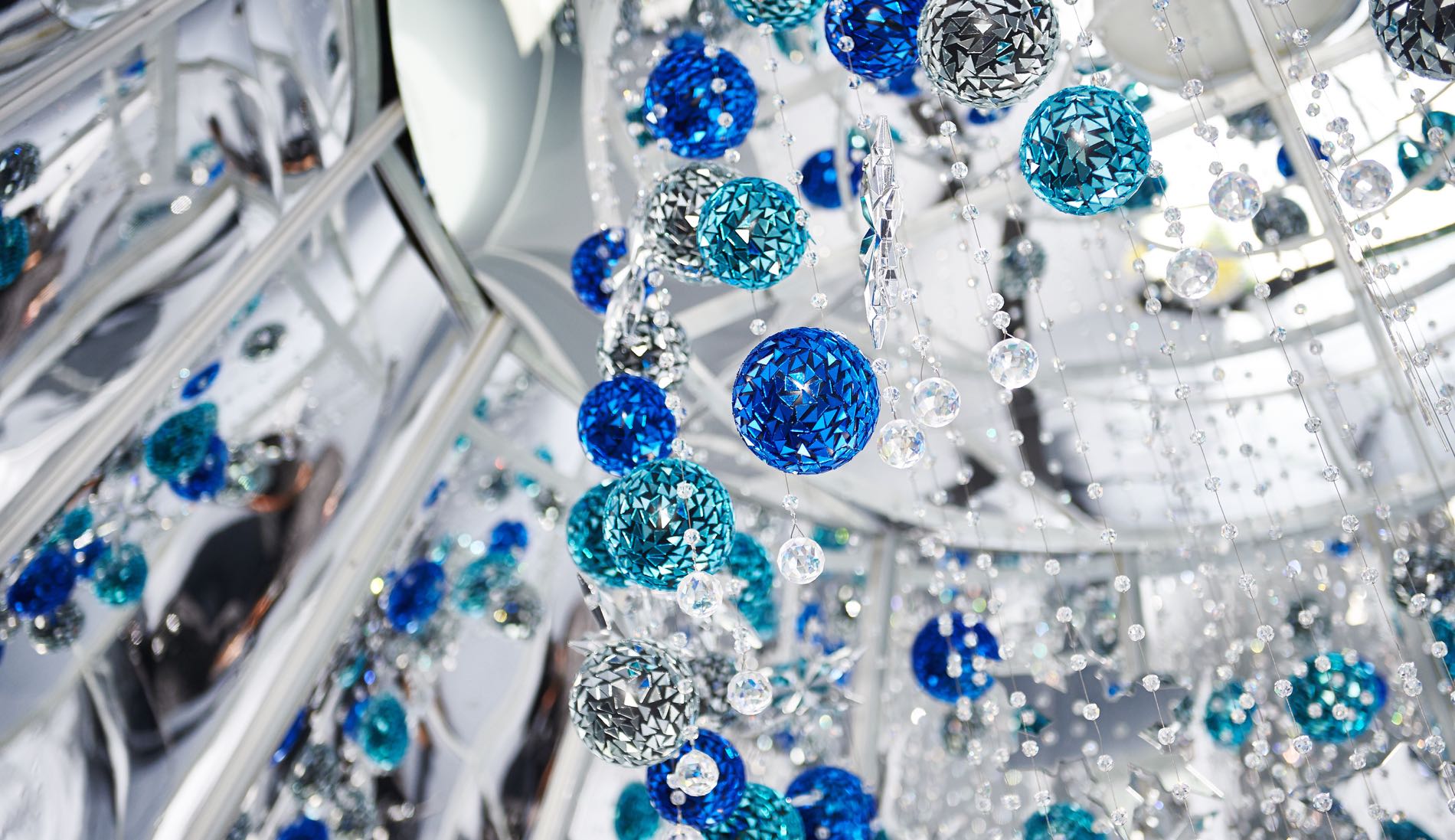 Внутри елки – комната из зеркал, а под потолком красуется люстра с голубыми, синими и белыми камнями.