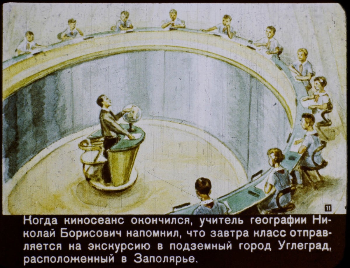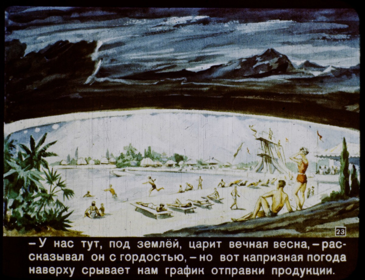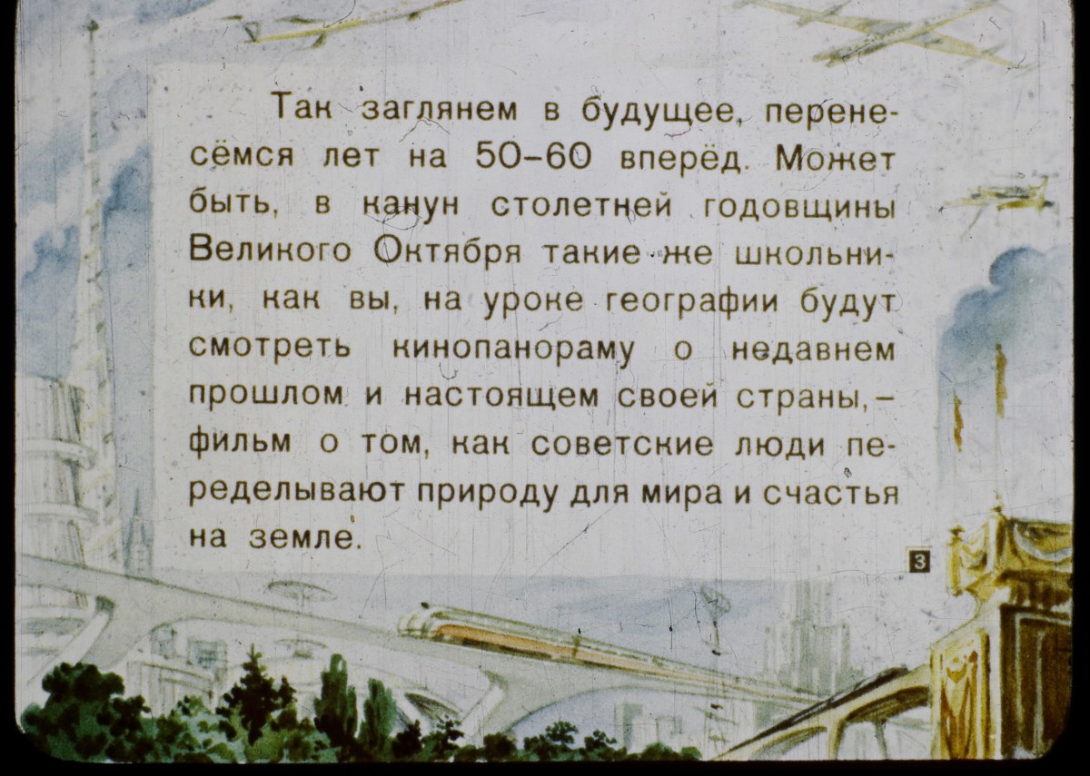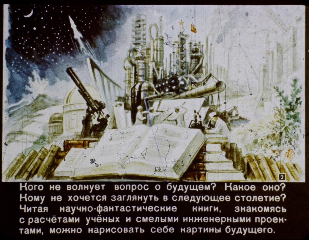 Диафильм так и называется: «В 2017 году». С точки зрения авторов, в этом году в СССР уже должны были появиться фотонные ракеты, роботы, телевидефоны и атомные поезда, а технологии использовались для улучшения климата Дальнего Востока и для освоения не только космоса, но и недр Земли.