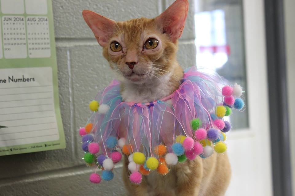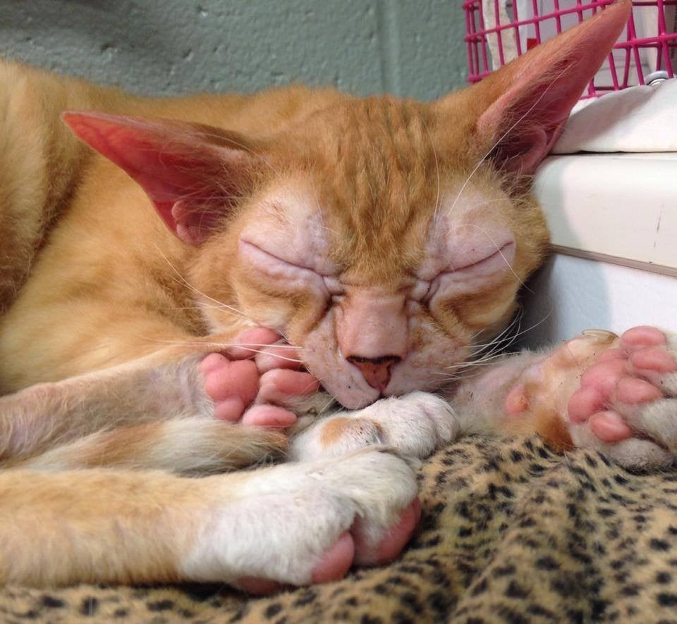 Как считают в приюте, где живет кот, необычная внешность их питомца связана с тем, что кот является смесью различных пород, в том числе сфинкса и корниш-рекса.