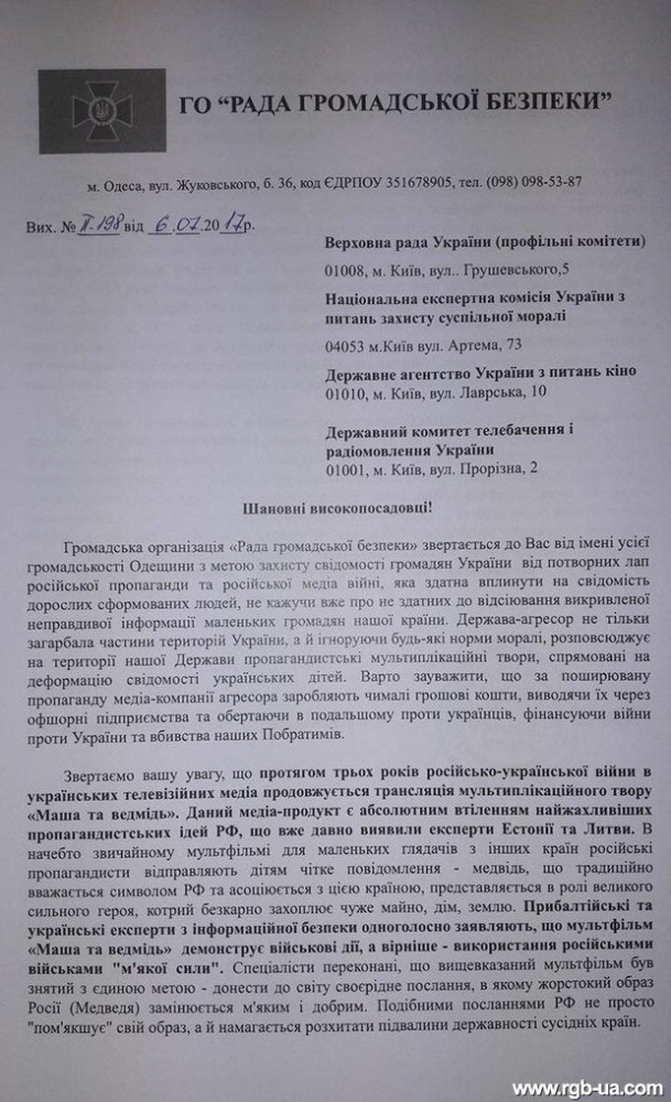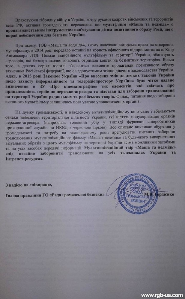 «Данный медиа-продукт является абсолютным воплощением самых ужасных пропагандистских идей РФ, что уже давно обнаружили эксперты Эстонии и Литвы. Будто бы в обычном мультфильме для маленьких зрителей из других стран российские пропагандисты отправляют детям четкое сообщение — медведь, традиционно считается символом РФ и ассоциируется с этой страной, представляется в роли большого сильного героя, который безнаказанно захватывает чужое имущество, дом, землю», — говорится в обращении.
