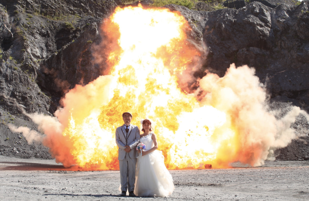 Супружеская пара из Японии устроила себе оригинальную свадебную фотосессию — со взрывами за спиной. Даже когда пиротехнические заряды сдетонировали и вспыхнуло пламя, герои остались неподвижными и сохранили полное спокойствие.