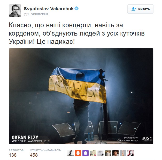 Святослав Вакарчук во время концерта в Польше развернул украинский флаг с надписью «Донецк». «Классно, что наши концерты даже за границей, объединяют людей из всех уголков Украины! Это вдохновляет», — от метил музыкант в своїм Твиттере.
