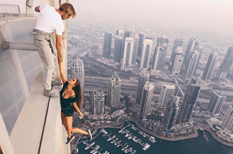 Ради эффектного кадра для социальной сети российская модель Виктория Одинцова забралась с фотографом на крышу небоскрёба в Дубае. Там она повисла в воздухе, держась за руку фотографа без страховки. Пользователи социальной сети шокированы безумным и бессмысленным поступком девушки.
